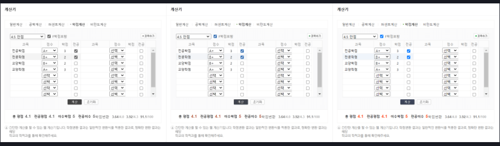 기말고사가 다가오면서 학점을 계산 하고자 하는 분들이 늘어나고 있습니다. 특히 취업 시즌이 되면서 각 회사에 지원서를 쓸때 학점 백분위를 계산해야 하는 경우가 자주 생기는데요. 재학중인 학교가 4.5 만점인지, 4.3 만점인지에 따라 계산 방식이 다른 만큼 주의를 기울여야 합니다.