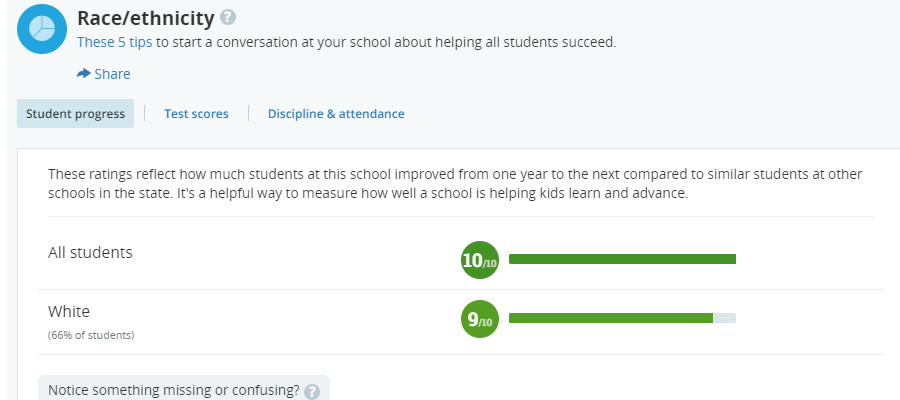 그 다음은 Equity 항목입니다. Race/ethnicity항목입니다. 1년동안 얼마나 학업이 향상되었는지를 보는 지표인데, 백인/전체학생으로 나누어 져 있습니다.